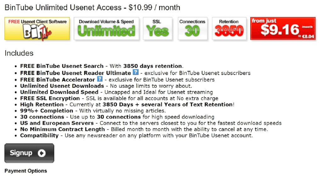 For those concerned with privacy, BinTube is a excellent option. Both the newsreader and the service itself feature SSL integration. In addition, the download accelerator can force SSL, even on other newsreaders. In addition, they provide secure and anonymous payment through Bitcoin, essential for anyone who is very concerned with privacy. It does not, however, come with a VPN, which you’ll have to get separately.