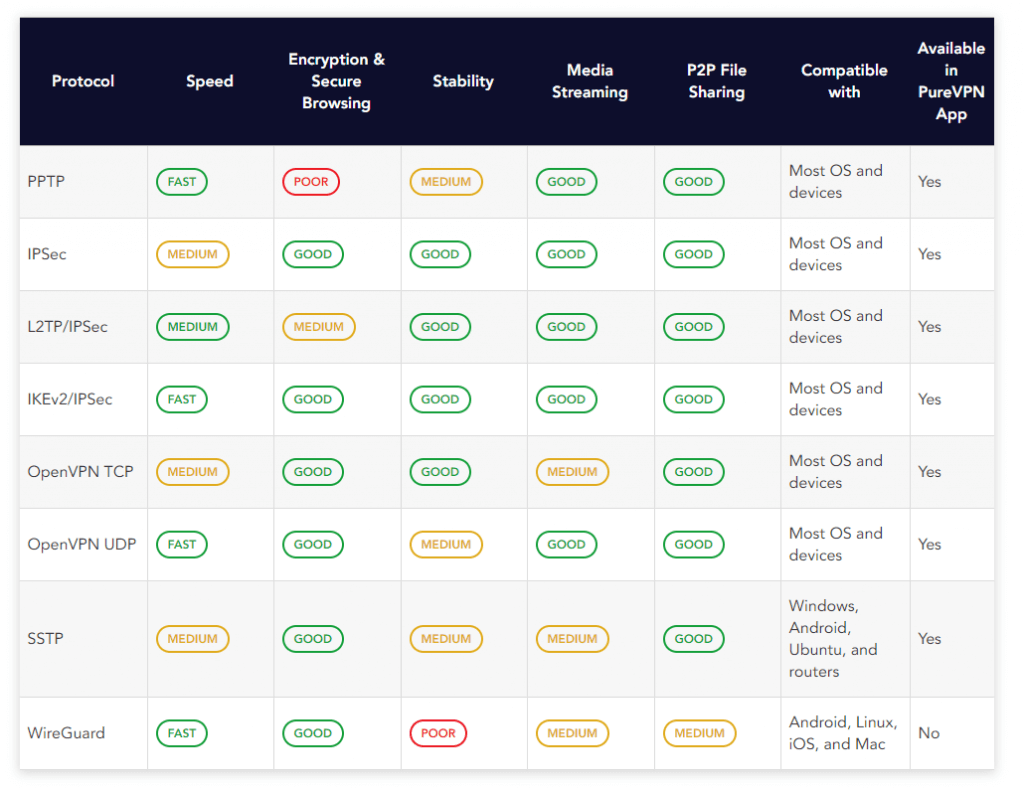 PureVPN offers a variety of secure VPN protocols which you can use depending on your requirement. If you are still unsure about what VPN Protocol best fits your needs, we have created a guide that will help you decide What are VPN Protocols? What VPN Protocol should I use? The following are the protocols offered by the PureVPN.