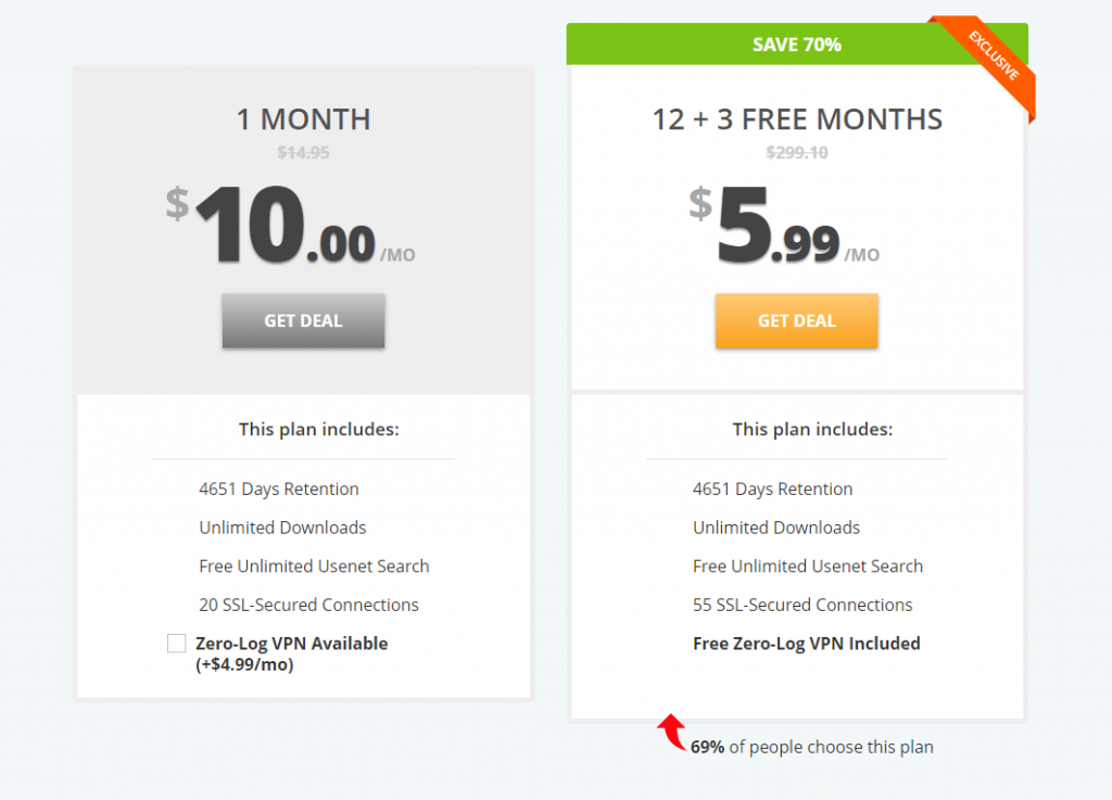 UsenetServer offers 2 special discounted packages for Usenet.com visitors. The packages are based on the duration of subscription, and you get more for less with the 12 month plan (60% off regular price) vs the 1 month plan (33% off regular price). As far as value, the best deal is their 12 month option, which comes out to $5.99 per month ($299.10 total, normally $239.28) and includes unlimited downloads, max retention, access to Global Search, 256-bit SSL secured connections, and a free zero-log VPN account.